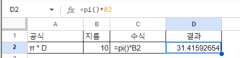 B2 셀에 지름 10 입력, 수식은 =PI()*B2 를 입력하면 지름으로 원의 둘레 구하는 계산식이 완성 됩니다.