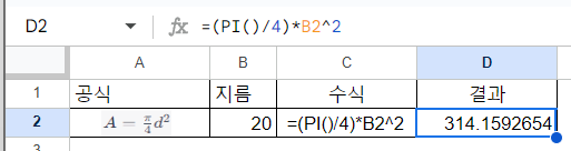 B2 셀에 지름 20 입력, 수식은 =(PI()/4)*B2^2를 입력하면 지름으로 원의 넓이 구하는 계산식이 완성됩니다.