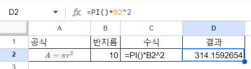 B2 셀에 반지름 10 입력, 수식은 =PI()*B2^2를 입력하면 반지름으로 원의 넓이 구하는 계산식이 완성됩니다.