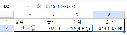 B2 셀에 둘레 62.83 입력, 수식은 =B2^2/(4*PI())를 입력하면 둘레로 원의 넓이 구하는 계산식이 완성됩니다.