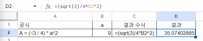 B2 셀에 a= 9 입력, 수식은 =(sqrt(3)/4*B2^2) 를 입력하면 정삼각형의 한 변의 길이를 이용해