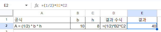 B2 셀에 b= 10, C2 셀에 h = 8 입력, 수식은=(1/2)*B2*C2를 입력하면 밑변과 높이를 이용해