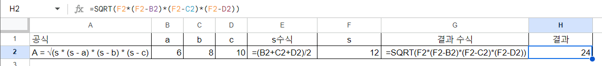 B2 셀에 a = 6, C2 셀에 b = 8, D2 셀에 c = 10, F2 셀에 s =(B2+C2+D2)/2 입력, 수식은