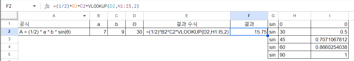 수식은=(1/2)*B2*C2*VLOOKUP(D2,H1:I5,2)를입력하면 두 변과 두 변 사이의 각도를 이용해