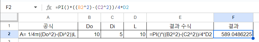 를 입력하면 외,내경원의 지름 및 길이로 원 파이프의 부피를 구하는 계산식이 완성됩니다.
