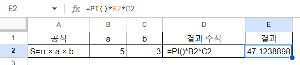 B2 셀에 긴 반지름 a= 5, C2 셀에 짧은 반지름 b= 4 입력,수식은 =PI()*B2*C2를 입력하면 반지름으로