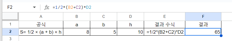 B2 셀에 밑변 a= 8, C2 셀에 윗변 b= 5, D2 셀에 높이 h=10 입력,수식은 =1/2*(B2+C2)*D2를 입력하면