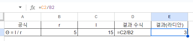 B2 셀에 반지름 r= 5, C2 셀에 호의 길이 l= 15 입력,수식은 =C2/B2 를 입력하면