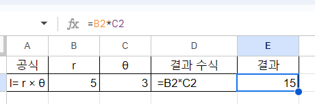 B2 셀에 반지름 r= 5, C2 셀에 중심각 θ = 3 입력,수식은 =B2*C2 를 입력하면