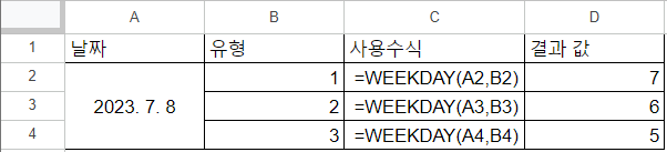 작성날짜인 2023.7.8 기준으로 WEEKDAY 함수사용 하여 결과를 얻어보았다