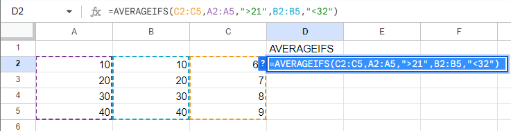 예를 들어, =AVERAGEIFS(C2:C5, A2:A5, ">20", B2:B5, "<30") 라는 수식은 A2:A5 범위에서 값이 20보다 크고 B2:B5 범위에서 값이 30보다 작은 셀의 C2:C5 범위 셀 값의 평균을 구합니다.