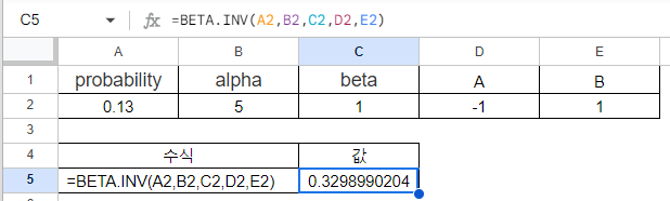 예를 들어, probability = 0.13, alpha = 5, beta = 1, A = -1, B= 1인 경우의 베타 분포 역함수 값을 구하려면 다음과 같은 수식을 사용할 수 있습니다: