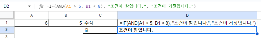 =IF(AND(A1 > 5, B1 < 8), "조건이 참입니다.", "조건이 거짓입니다.")