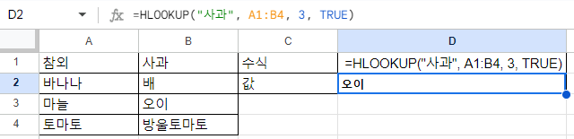 =HLOOKUP("사과", A1:B4, 3, TRUE)
