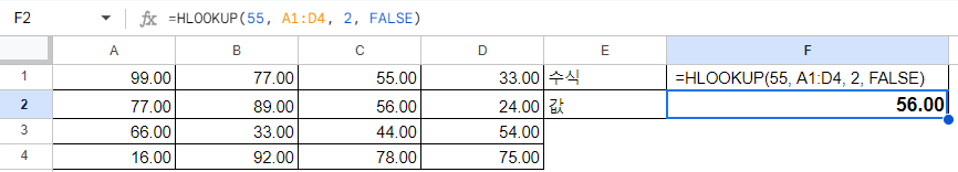 이 경우, A1:D4 범위에서 정확히 55와 일치하는 값을 찾아서, 해당 값이 위치한 2번째 행의 데이터를 반환합니다.