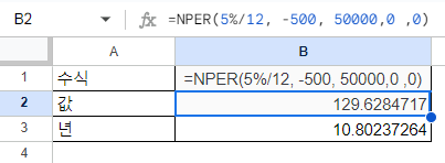 위의 식을 셀에 입력하면, 약 129.62 개월(약 10년 8개월)이 필요하다는 결과가 나옵니다. 즉, 연 이자율 5%로 50,000달러의 대출을 매월 500달러씩 상환한다면 약 10년 8개월 후에 전액을 상환할 수 있습니다.