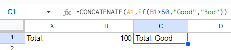 =CONCATENATE(A1, IF(B1 > 50, "Good", "Bad"))